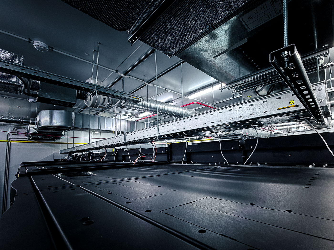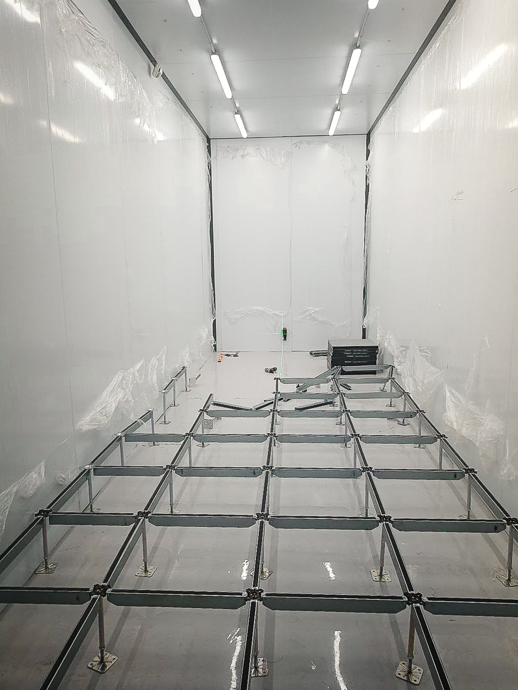 - Подготовка основания для фальшпола в виде наливного пола на эпоксидной основе, монтаж фальшпола плитами из сульфата кальция;